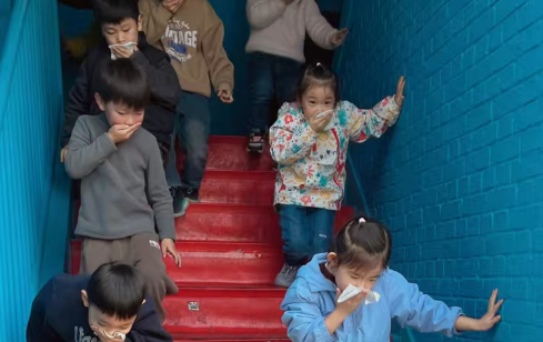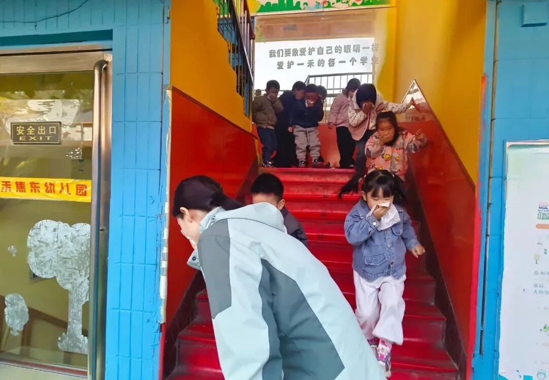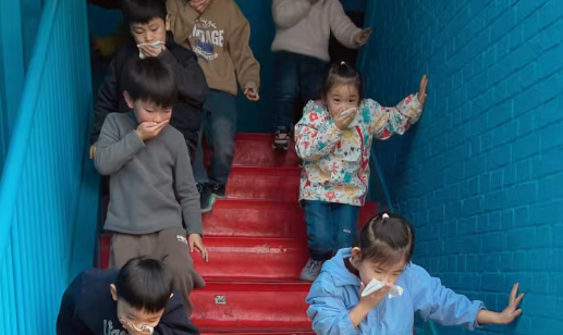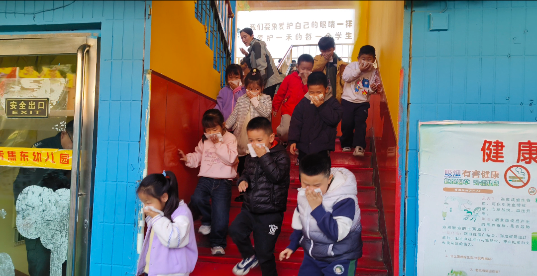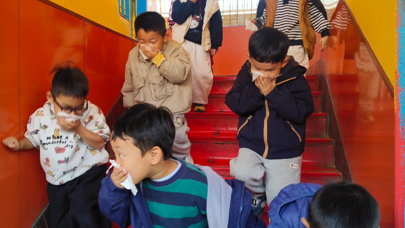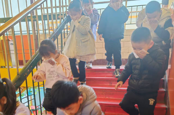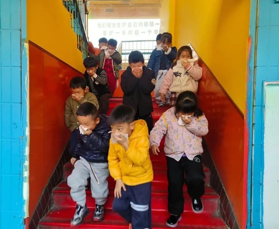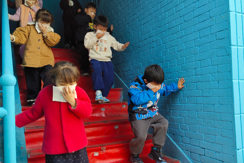 警報聲一響演練正式開始。只見小朋友們在老師的指揮下,貓著腰、雙手捂著口鼻快速有序地順著樓梯向老師指定的位置逃生。整個演練活動緊張有序。