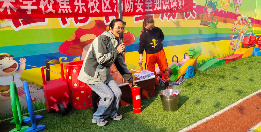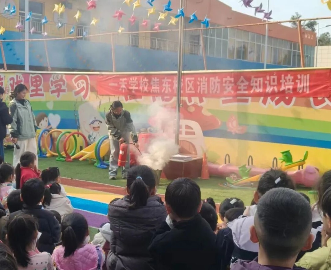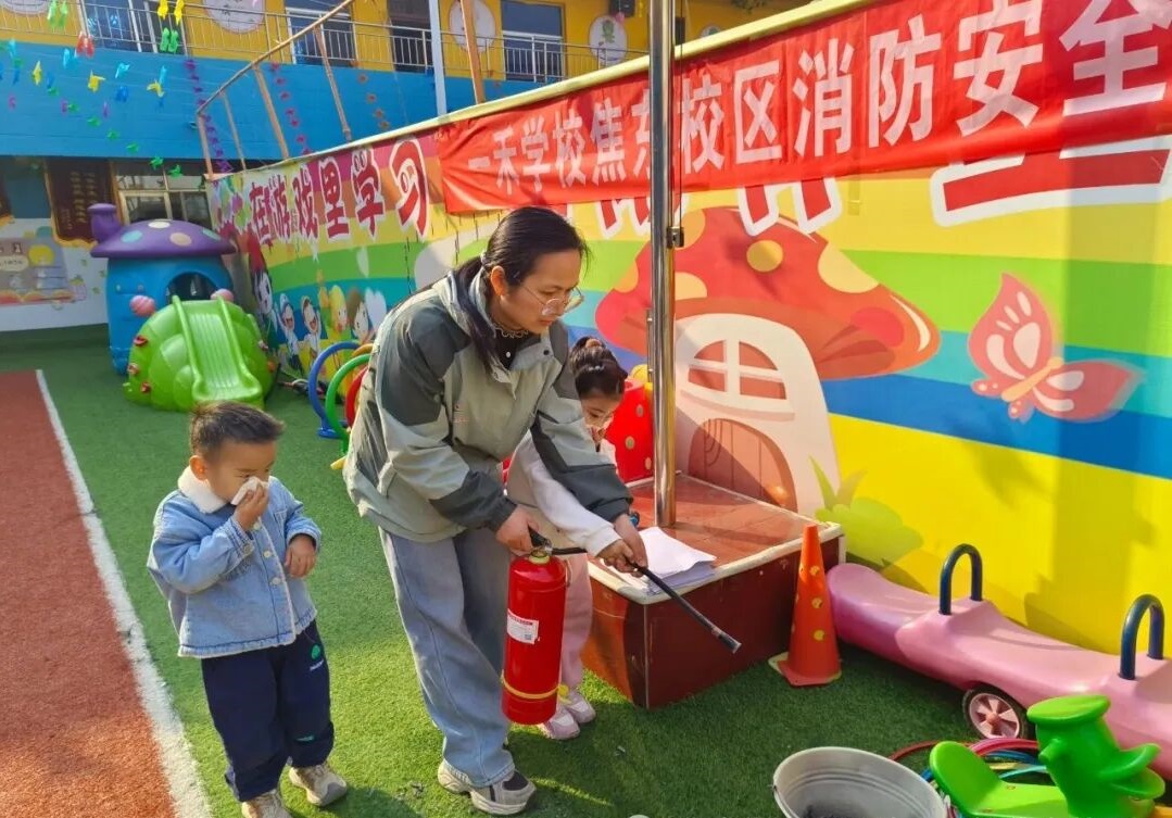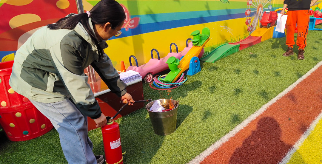 一切完畢后,全體師生共同在操場上觀看如何正確使用滅火器滅火。“一提、二拔、三握,四壓”,教職工們進行了實際操作,幼兒也親身體驗滅火器滅火,掌握消防器材使用技能,提高應對初級火災的能力。